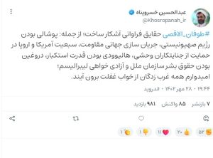 طوفان_الاقصى حقایق فراوانی آشکار ساخت؛ از جمله: پوشالی بودن رژیم صهیونیستی، جریان سازی جهانی مقاومت، سبعیت آمریکا و اروپا در حمایت از جنایتکاران وحشی، هالیوودی بودن قدرت استکبار، دروغین بودن حقوق بشر سازمان ملل و آزادی خواهی لیبرالیسم؛