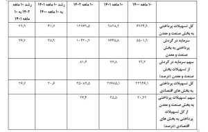 تسهیلات پرداخت شده شبکه بانکی کشور به بخشهای مختلف اقتصادی حوزه کسب و کار طی ۱۰ ماهه سال ۱۴۰۱ معادل ۱۲۷۶۹٫۵ هزار میلیارد ریال بوده است که نسبت به رقم دوره مشابه سال قبل به میزان ۲۹٫۹ درصد افزایش نشان میدهد. از تسهیلات پرداخت شده در بخش صنعت و معدن ۸۱٫۶ درصد صرف سرمایه در گردش واحدهای صنعتی و معدنی شده است.