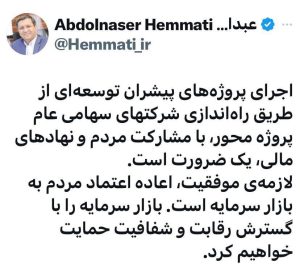 به گزارش پایگاه خبری طلوع تعاون به نقل از شادا، دکتر همتی در این نوشته تأکید کرده است، لازمه‌ی موفقیت، اعاده اعتماد مردم به بازار سرمایه است.